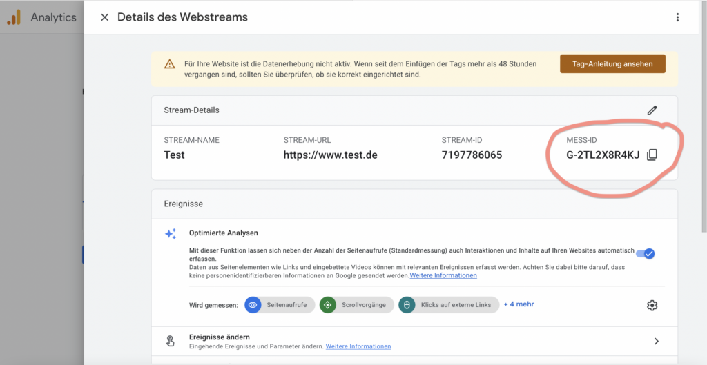 Du findest deine Mess-ID in deinem Google Analytics Konto. Nach dem Einloggen, klicke unten links auf “Verwaltung”, dann auf Datenstreams und wähle schließlich dein Konto aus. Es öffnet sich ein neues Fenster, hier siehst du deine Google Analytics ID, die mit “G-” beginnt.