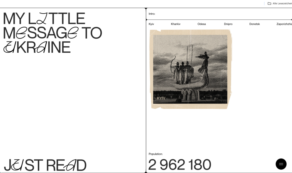 The Message to Ukraine ist schon mehr Kunst als Website – mit Scroll-Effekten, Illustrationen und vielen interaktiven Elementen wird hier eine große und ganz viele kleine Geschichten erzählt.